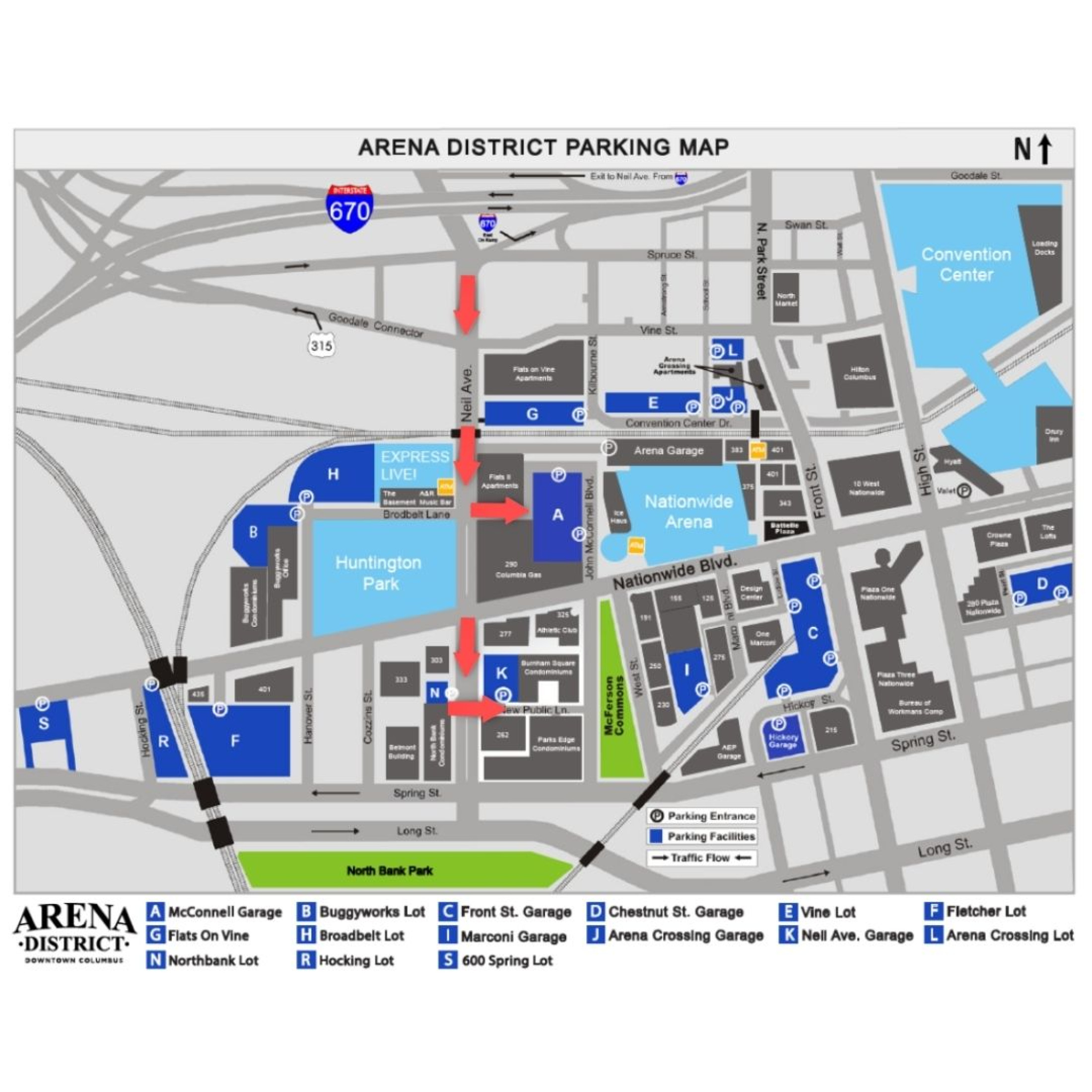 The Start Line is a short walk west on Nationwide Boulevard from both garages.